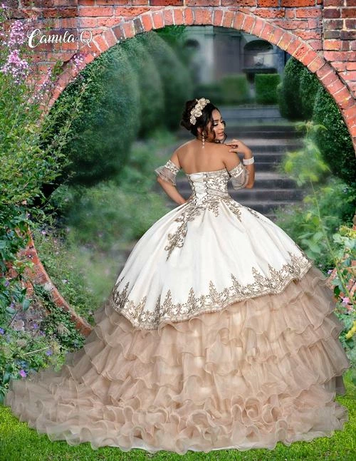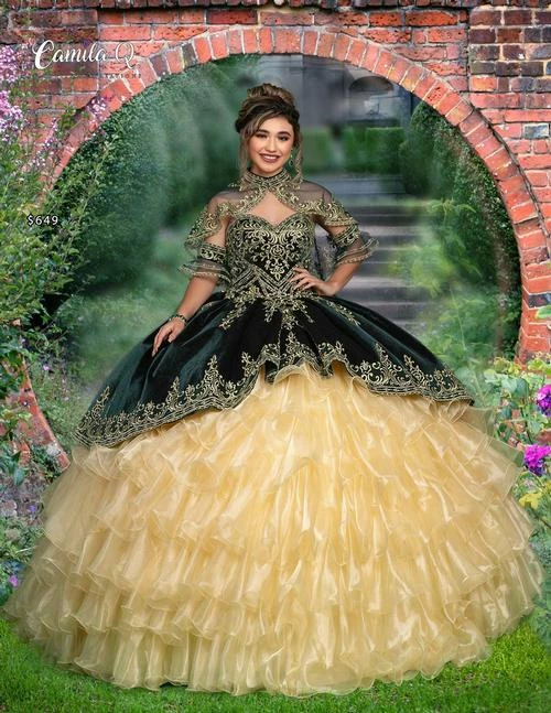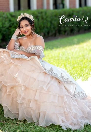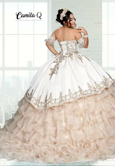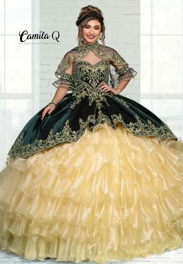Camila Q Quinceanera Q1112 off the shoulder straps with a little extra organza on the sleeve sweetheart neckline velvet and organza ruffle Quince Ball Gown with corset lace up back and matching sheer cape