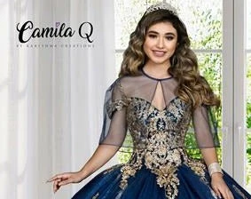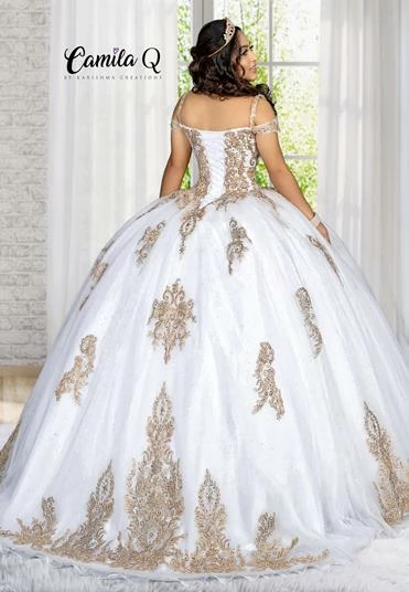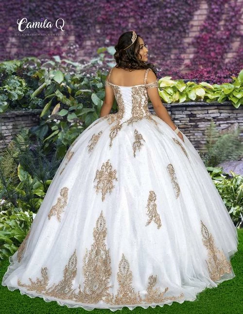 Camila Q Quinceanera Q1115 off the shoulder with a strap glittered tulle ball gown with embellished applique lace and lace up corset back. Perfect for your next Quince or Sweet 16.Â