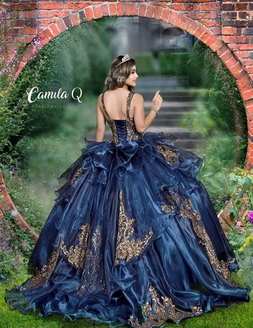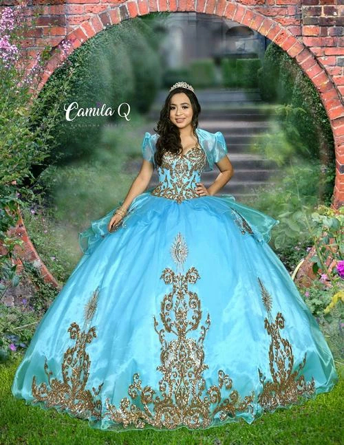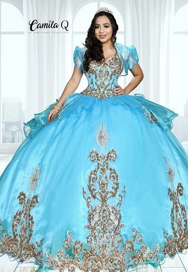 Camila Q Quinceanera Q1119 sheer flowy organza that as beaded with sequin details has a sweetheart neckline with beaded straps and lace up corset back.Â