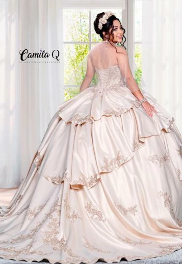 Camila Q Qinceanera Q1121 strapless sweetheart neckline lace up corset bodice and full skirt with layers of embroidered satin. Perfect for your next sweet 16, Quince or special event.