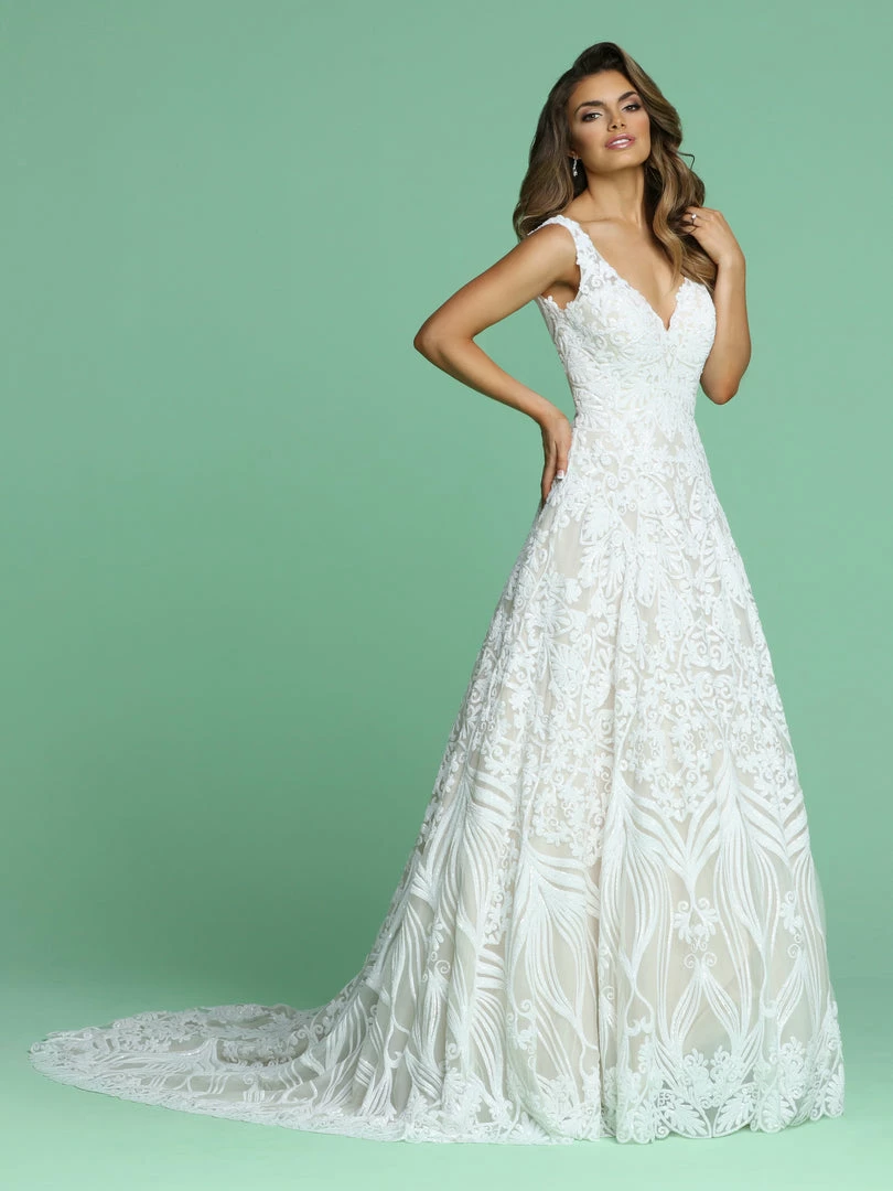 Davinci Bridal 50613 is a stunning long A Line Sequin Pattern Wedding Dress. Featuring a V Neckline with wide straps leading around to an open V back. This Shimmering gown is a true Fairytale Princess Gown!