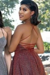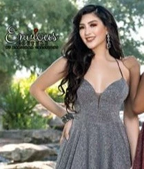 Envious Couture E1623 plunging v neckline with sheer panel sparkle glitter jersey A line prom dress open corset lace up tie corset back. This long ball gown is perfect for you prom, pageant or next formal event.