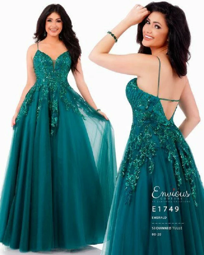 Envious Couture E1749 Emerald Prom Dress. This long prom dress is a ballgown style with sequins throughout the bodice and streaming down the top half of the skirt. It has a sweetheart neckline with a sheer panel and spaghetti straps that cross over the shoulders and are held together by a single embellished strap. This Aline or ballgown evening gown is perfect for prom.