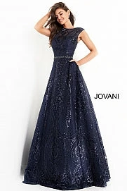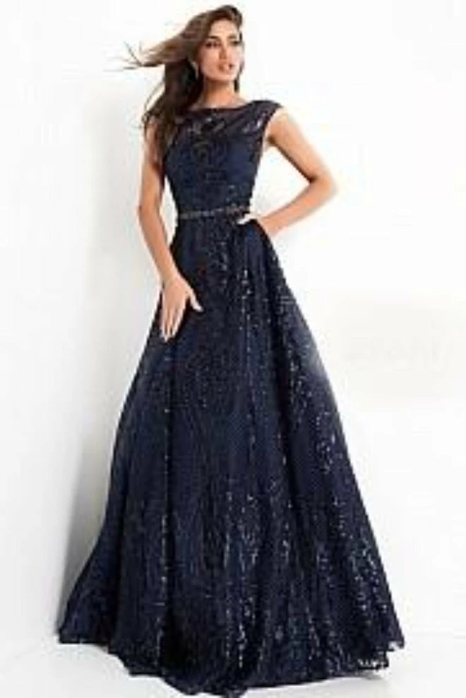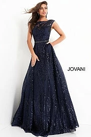 Jovani 02514 Floor-length A-line navy mother of the bride dress with embellished belt features skirt with pockets and cap sleeve bodice with high neck and V back. Prom, Pageant, Evening and Military Ball Gown.