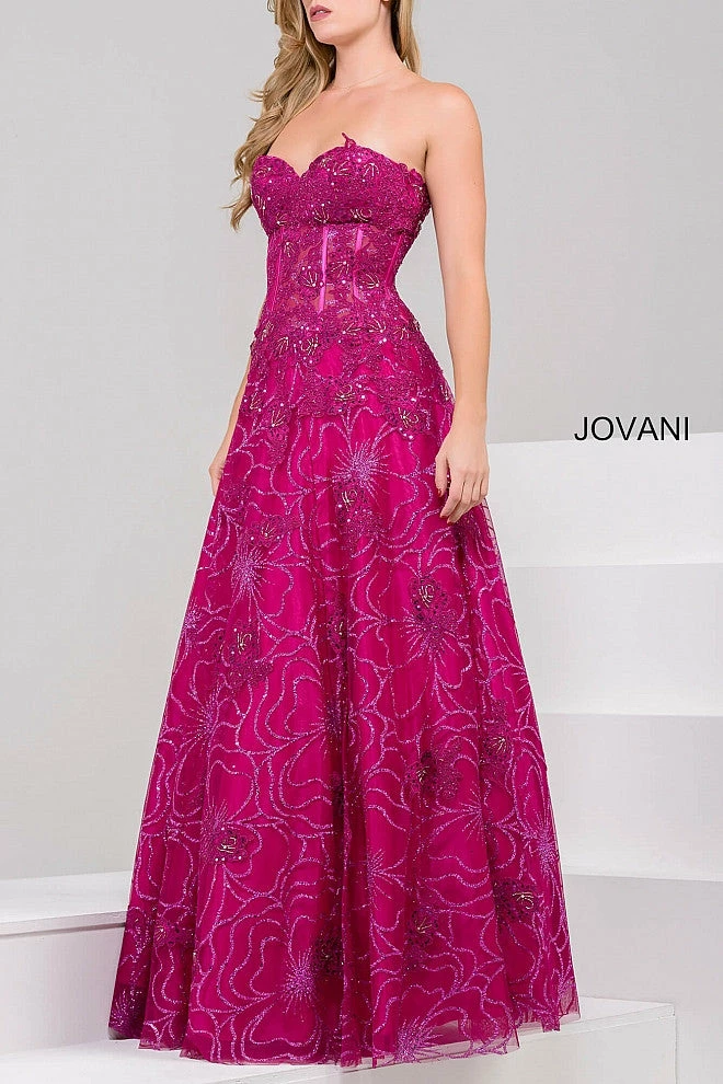 - Details – Strapless A-Line Ballgown. Strapless Sweetheart Neckline. Sheer Corset Bodice with Visible Boning. Glitter Lace Fabric with Beading and Appliques. Full Skirt with Pleating.Â
