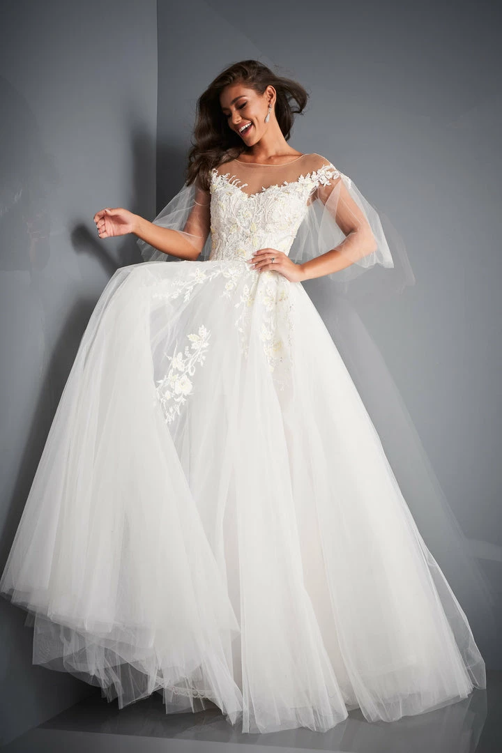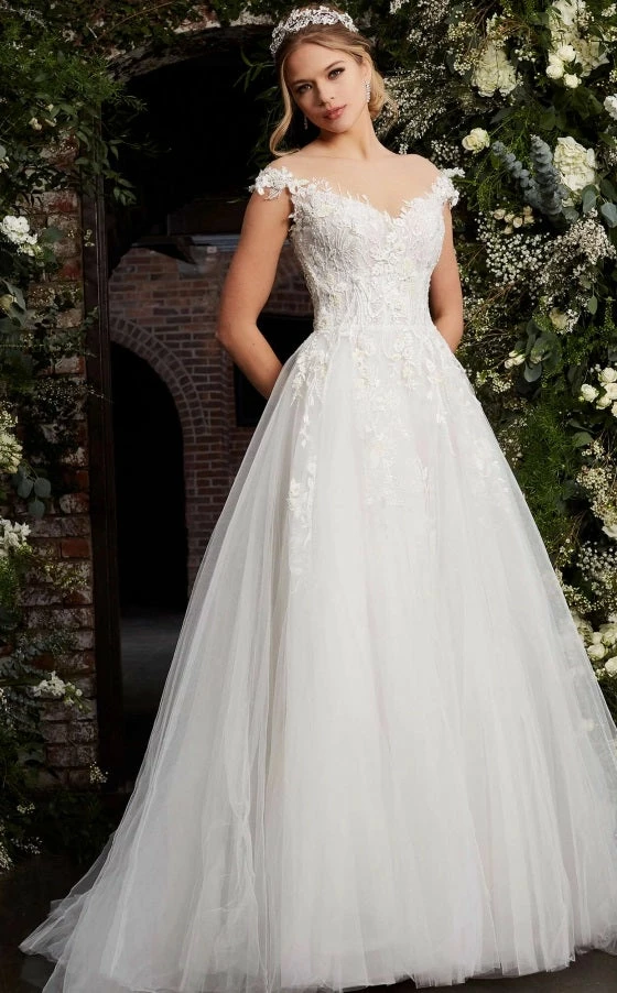 Jovani Bridal JB67209 Long A Line off the shoulder wedding dress sheer sleeve lace