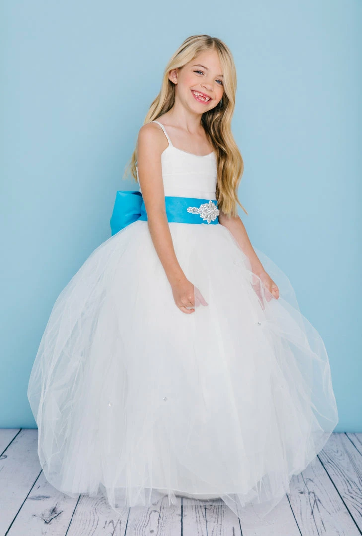 Rosebud Fashions Style 5130 is a full length dress with a full tulle skirt with pickups accented with rhinestones. The bodice is tulle overlay with spaghetti straps and a V neckline and a V Back. The waist is accented with a 26/30 Bling Sash that ties in the back with a detachable Bling Bow. Satin buttons cover the zipper. Flower Girl Dress First Communion Gown, Tulle Ballgown