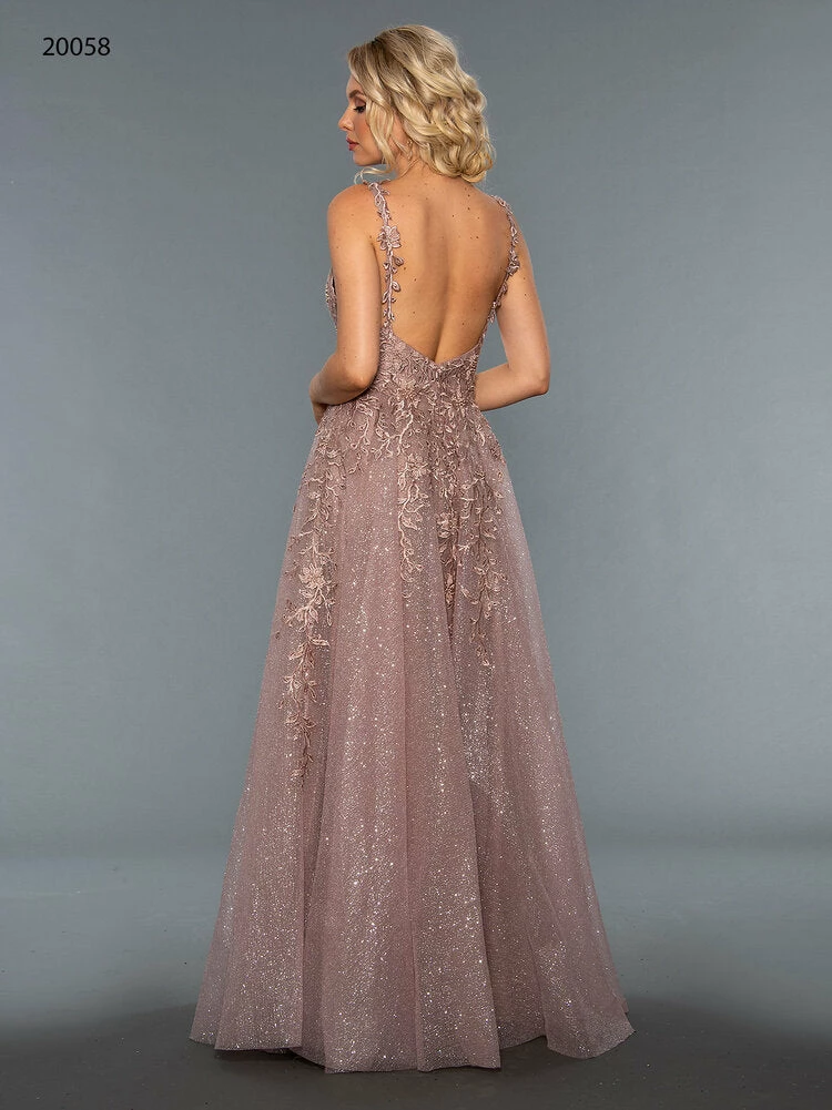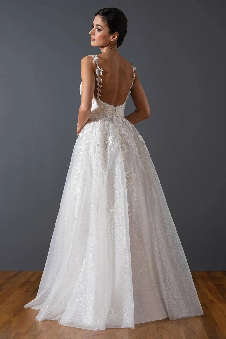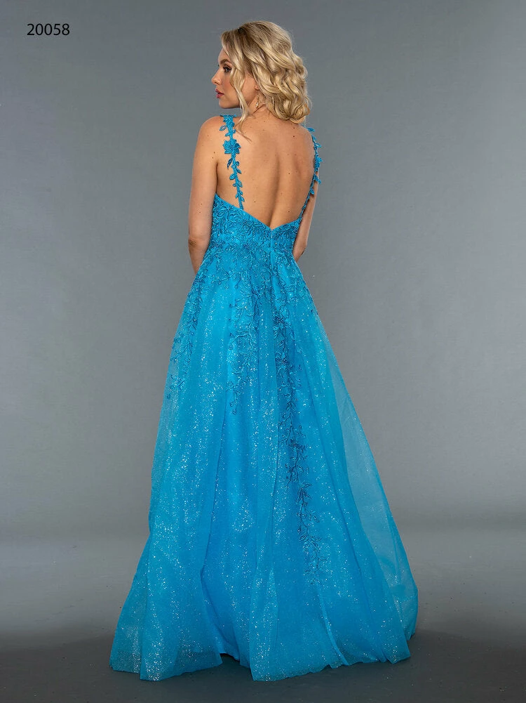 Stella Couture 20058Â Long Lace fitted bodice with v neck and lace embellished straps. Shimmer A line skirt with a slit. Great formal Prom Dress, Pageant Gown or casual Bridal – wedding dress.Â