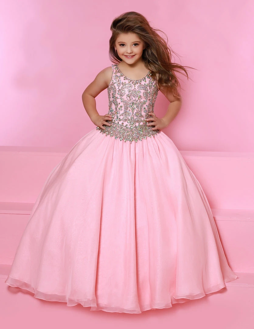 Sugar Kayne C155 This is a long chiffon girls a line pageant ball gown. It has a Fully Embellished bodice and scoop neckline.Â