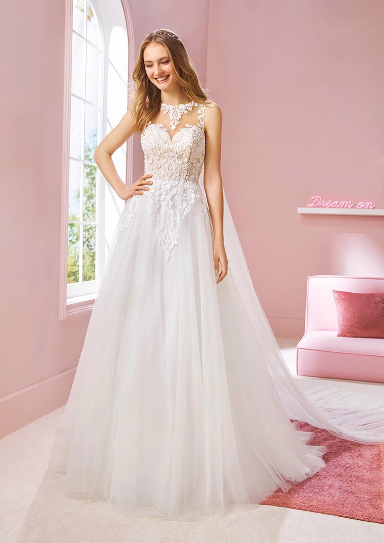 This illusion neckline creates a cool necklace effect, with curling cuts of lace that line the collarbones, straps, and sweetheart bodice, finishing in a sparkling peplum over a tulle princess skirt.