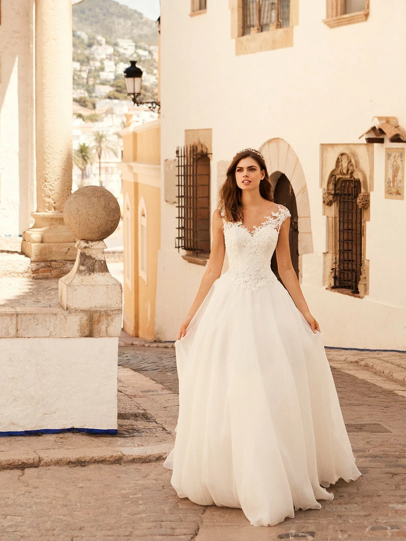 Wedding dress with princess cut and tattoo-effect back with delicate lace cap sleeves and A line ball gown skirtÂ