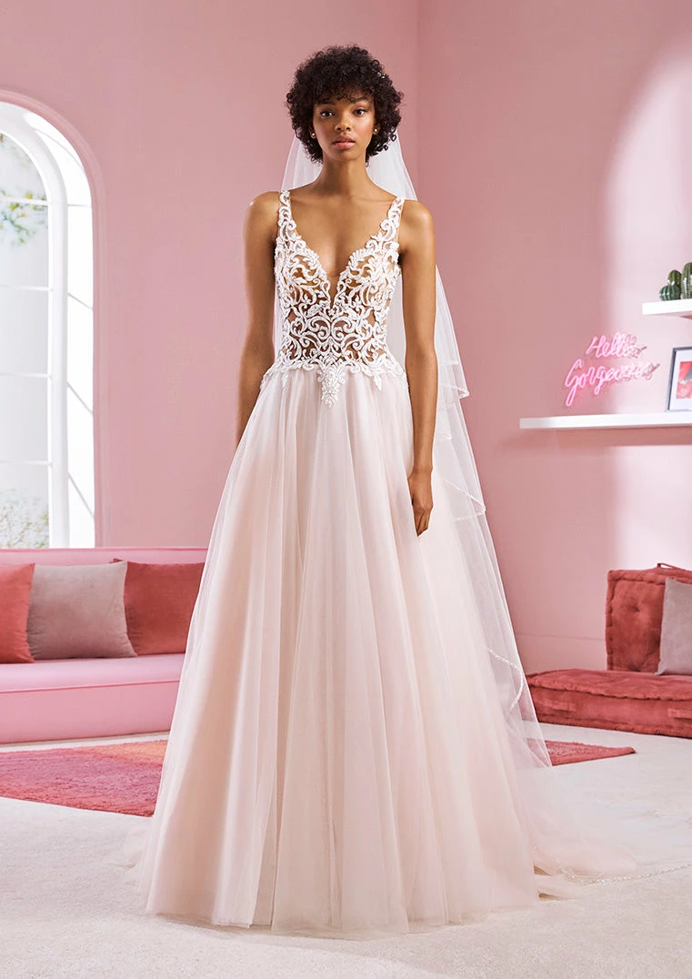 Sheath gown crafted in blush pink tulle with an illusion, plunge bodice of swirling lace placements that line the straps and finish at a gentle peplum waistband.