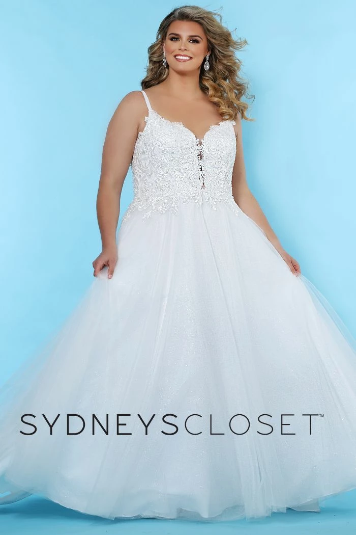 Sydney’s Closet SC5239 Josie You’re a modern, fashionable bride with a nod to the traditional in this plus size lace applique wedding dress. Exquisite beaded lace bodice with V-neckline and spaghetti straps. Flattering A-line silhouette with a glitter tulle skirt. Plunging V-neckline trimmed with lace appliques adds a hint of sex appeal. Center-back zipper and chapel train. SC 5239