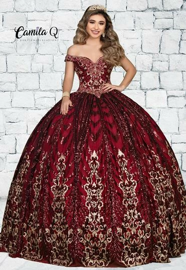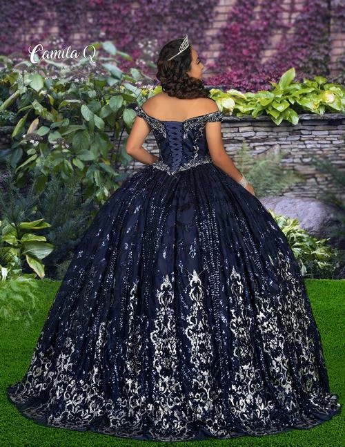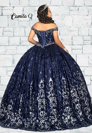 Camila Q Quinceanera Q1114 off the shoulder beaded sequin tulle Quince Gown with lace up corset back