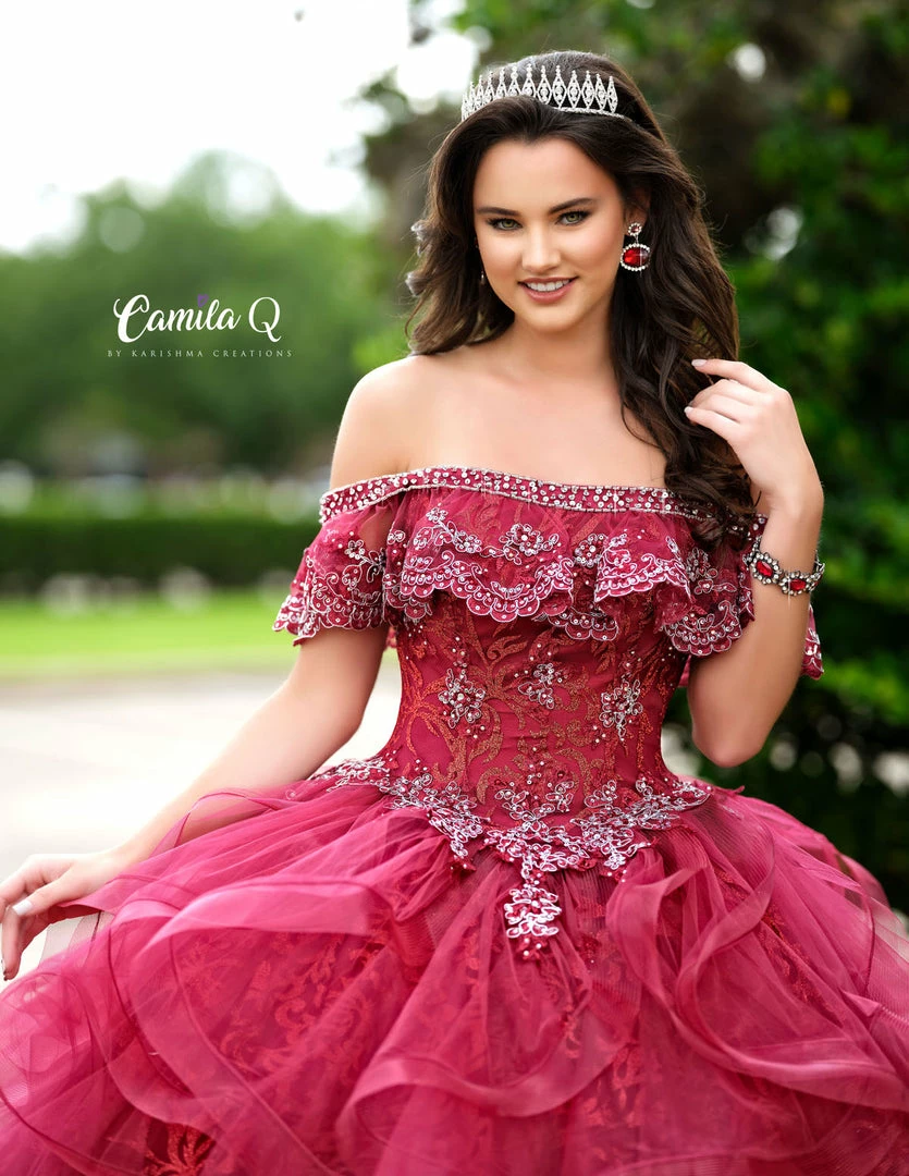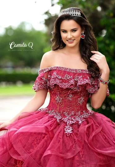 Camila Q Quinceanera Dress Q1010 off the shoulder ruffle neckline embellished bodice and layers of ruffles full skirt. Sweet Sixteen DressÂ