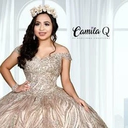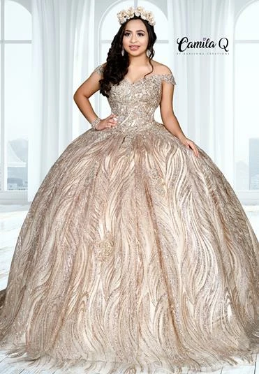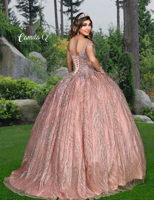 Camila Q Quinceanera Q1118 off the shoulder glittered tulle ball gown with lace up corset back full ball gown skirt