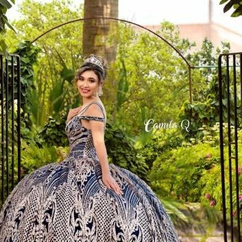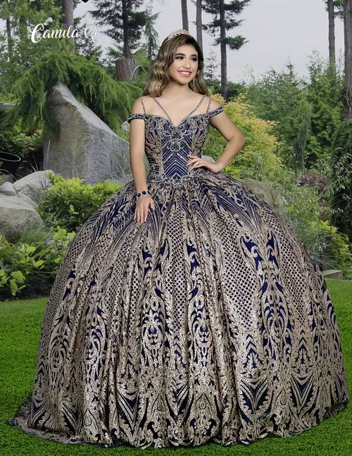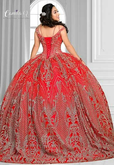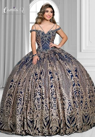 Camila Q Quinceanera Q1120 off the shoulder with double straps that cross over the shoulders and down to the lace up corset back. This ball gown is mega glittered and over the top for your next Quince, Sweet 16, Prom or next special event.