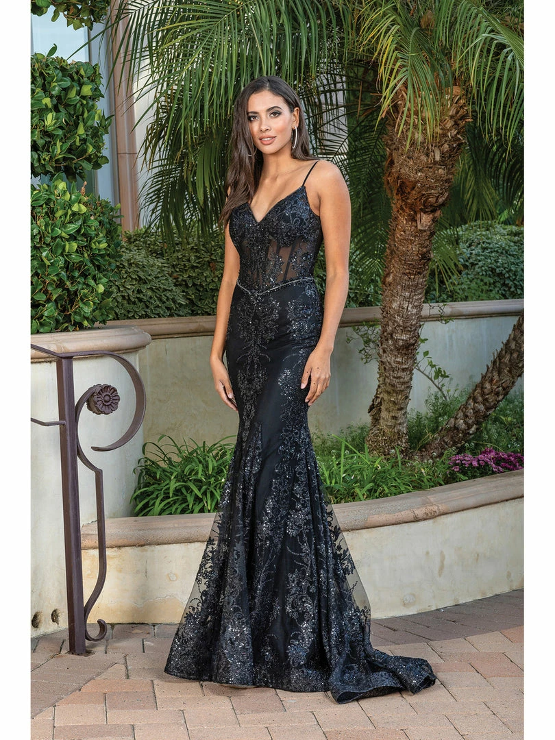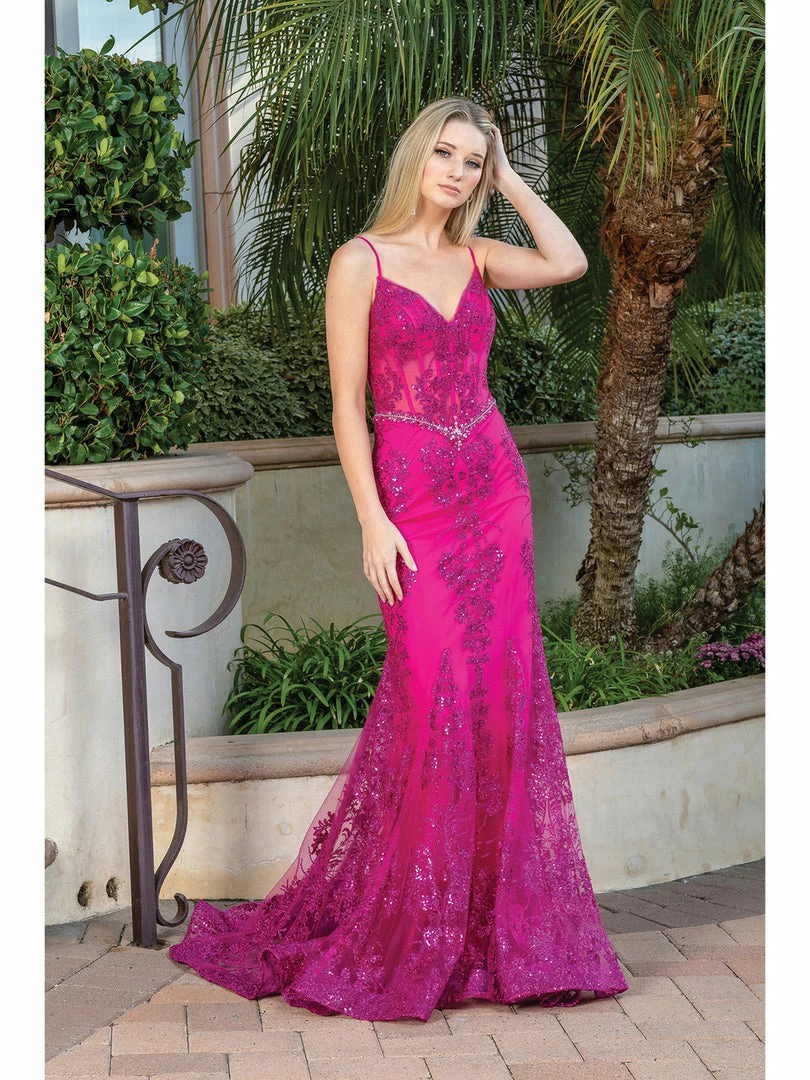 DQ 4118 is a Long fitted Sequin Mermaid Prom Dress & Pageant Gown. Featuring a V Neckline with a sheer bodice with boning & Crystal Belt. Mermaid Silhouette with sweeping train.
