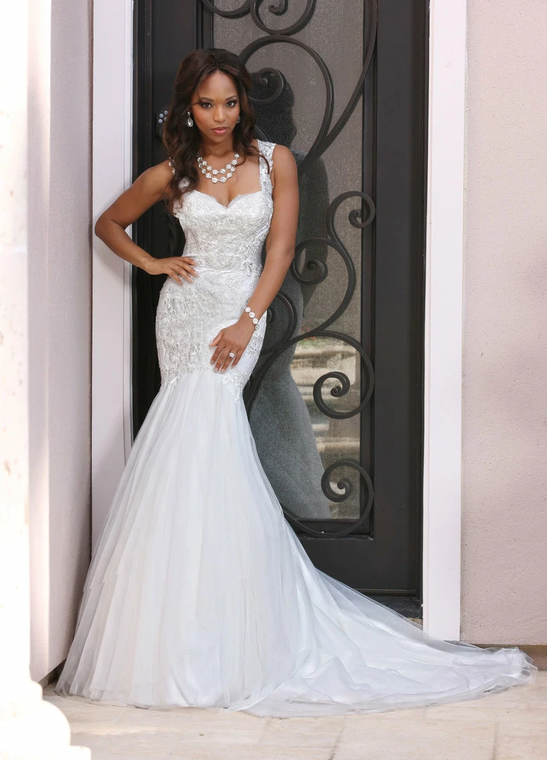 Davinci Bridal 50373 Tulle & Lace Mermaid Wedding Dress features a Fitted Lace Bodice with Sweetheart Neckline,Sheer Lace Straps with Back Shoulder Detail & Keyhole. Generously Layered Mermaid Skirt Flares from the Knee into a Chapel Train.