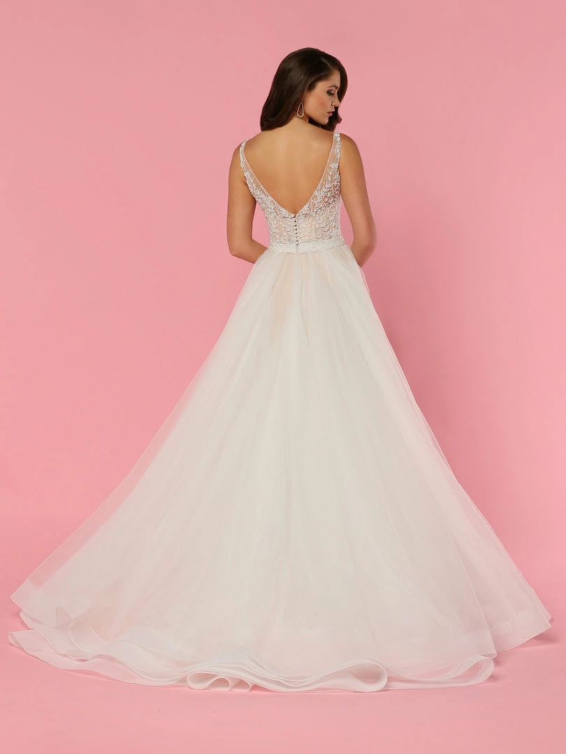 Davinci Bridal 50440 is a Tulle A-Line Wedding Dress features Beaded Bodice,Sheer Beaded Straps,Low V-Back,Covered Buttons & Beaded Waistband. Full Ball Gown Skirt with Wide Opaque Tulle Ribbon Edging ends in Chapel Train.