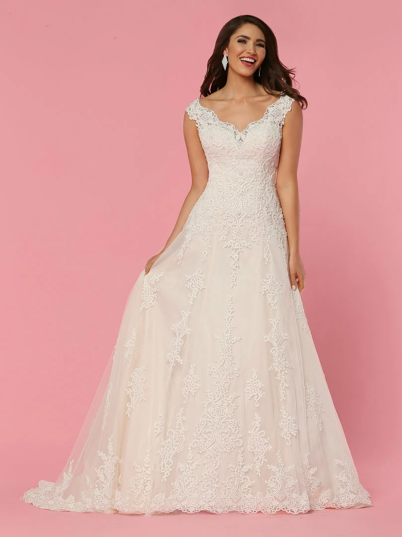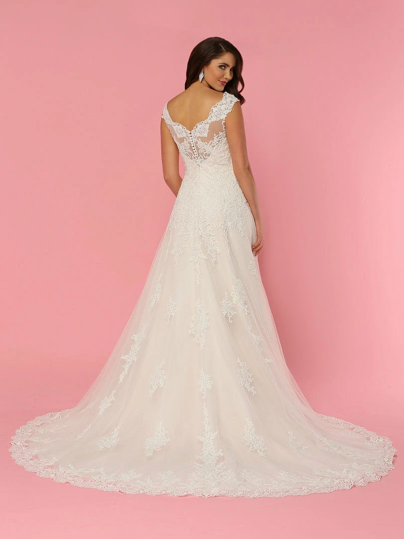Davinci Bridal 50444 Long Tulle & Lace A-Line Wedding Dress features a Lace Bodice with V-Neckline,Sheer Lace Straps & V-Design Sheer Lace Back with Covered Buttons. Lace Applique Skirt with Scalloped Lace Hem ends in a Chapel Train.