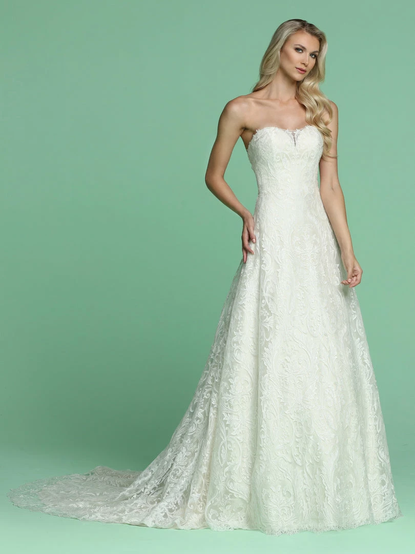 Davinci Bridal 50609 is a beautiful all over lace A Line wedding Dress. This Strapless gown features an illusion sheer sweetheart neckline. Fitted bodice flowing into an a line ballgown with a scallop lace hem. Long Line Lace Up Corset Back. Stunning sweeping train.Â