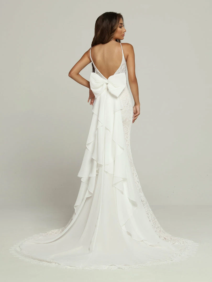 Davinci Bridal 50694 Boho Lace Romantic Mermaid Wedding Dress Bow Chiffon Bridal Gown Elegant with a Sweet Surprise, this Lace Fit & Flare Sheath Wedding Dress features a Plunging V-Neckline with Modesty Panel & a Low V-Back. A Wide Ruched Waistband sets off the Lace Skirt with its Chapel Train. The Surprise is the Oversized Back Bow & Ruffled Waterfall Style Chapel-Length Panel.