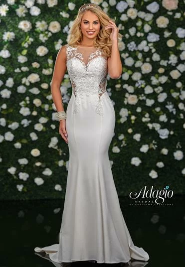 Adagio Bridal W9337 sheer lace neckline with sweetheart bodice and sheer back with lace applique and bridal buttons jersey wedding gown bridal dress