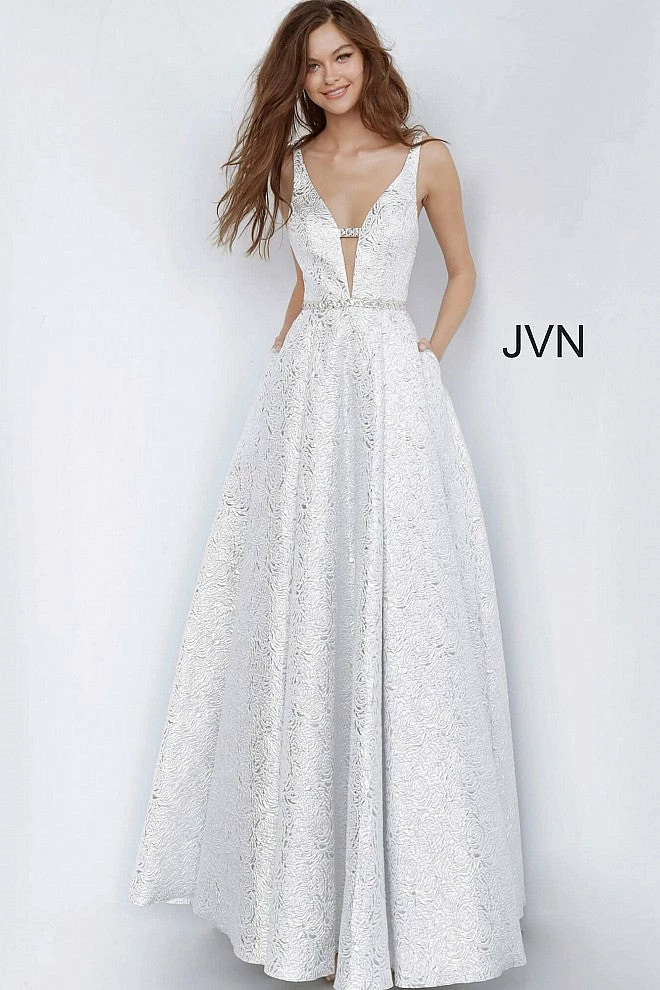 Jovani JVN 02263 is a full ball gown prom dress. featuring a deep plunging neckline with Embellished straps and waist belt. Open Back with Crystal Straps. Full Skirt has Pockets! JVN02263