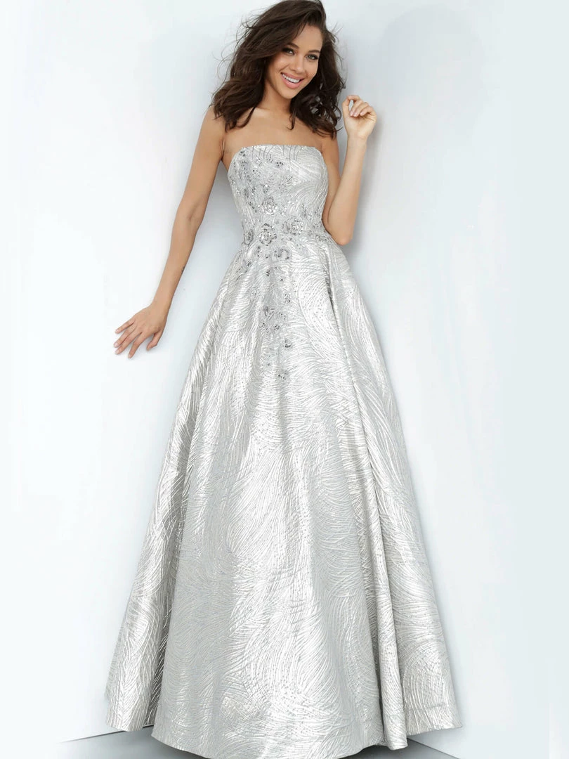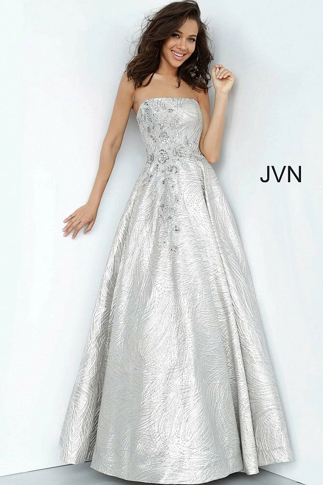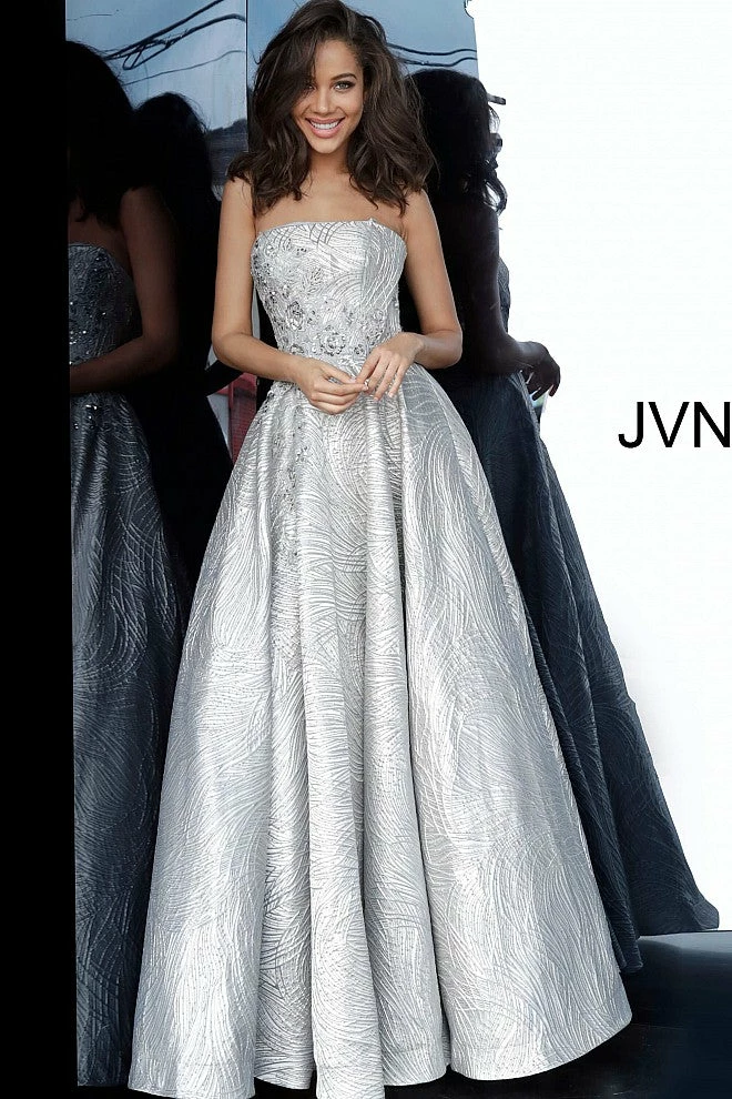 Jovani JVN02323 is a long silver strapless ballgown prom dress with a straight neckline and corset lace up back. Stunning Swirl Details sequin floral embellishments make this evening gown a true show stopper! JVN 02323