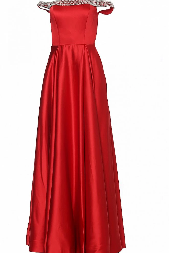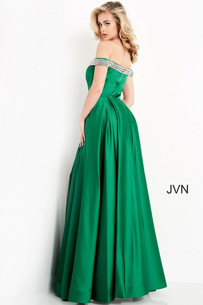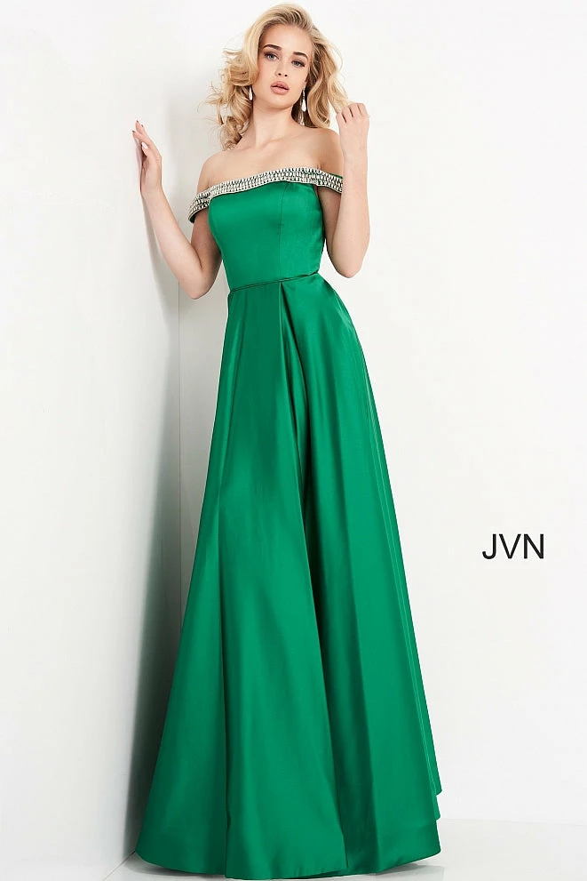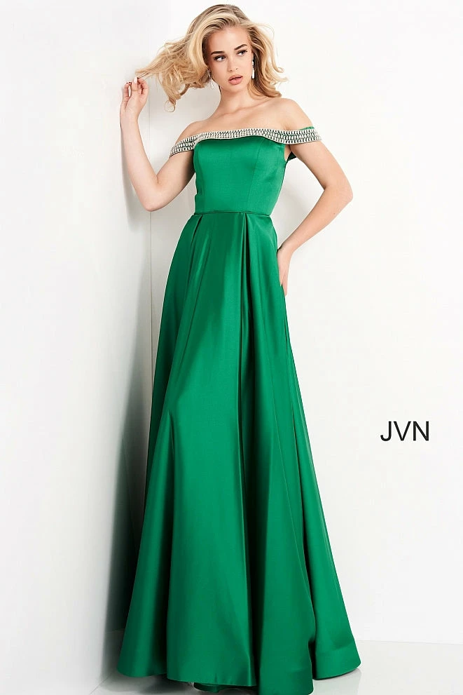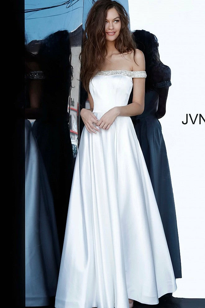 Jovani JVN2282 is a long satin off the shoulder evening gown prom dress. featuring Embellished Off the Shoulder straps. Full silky pleated skirt has Pockets! Perfect for pageant or informal wedding dress. Pageant gown, prom dress, evening gown.