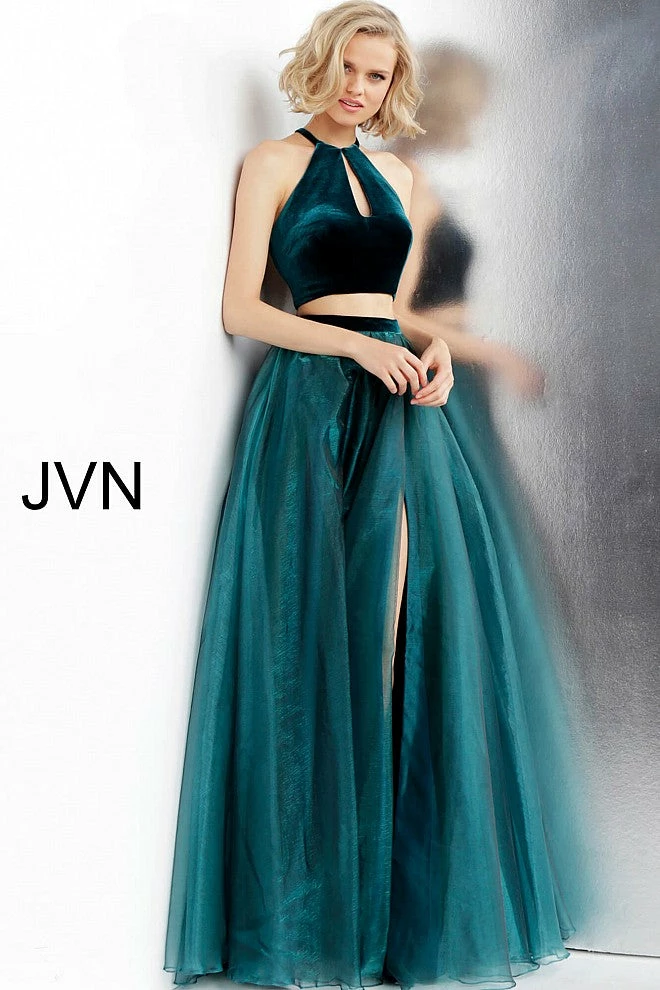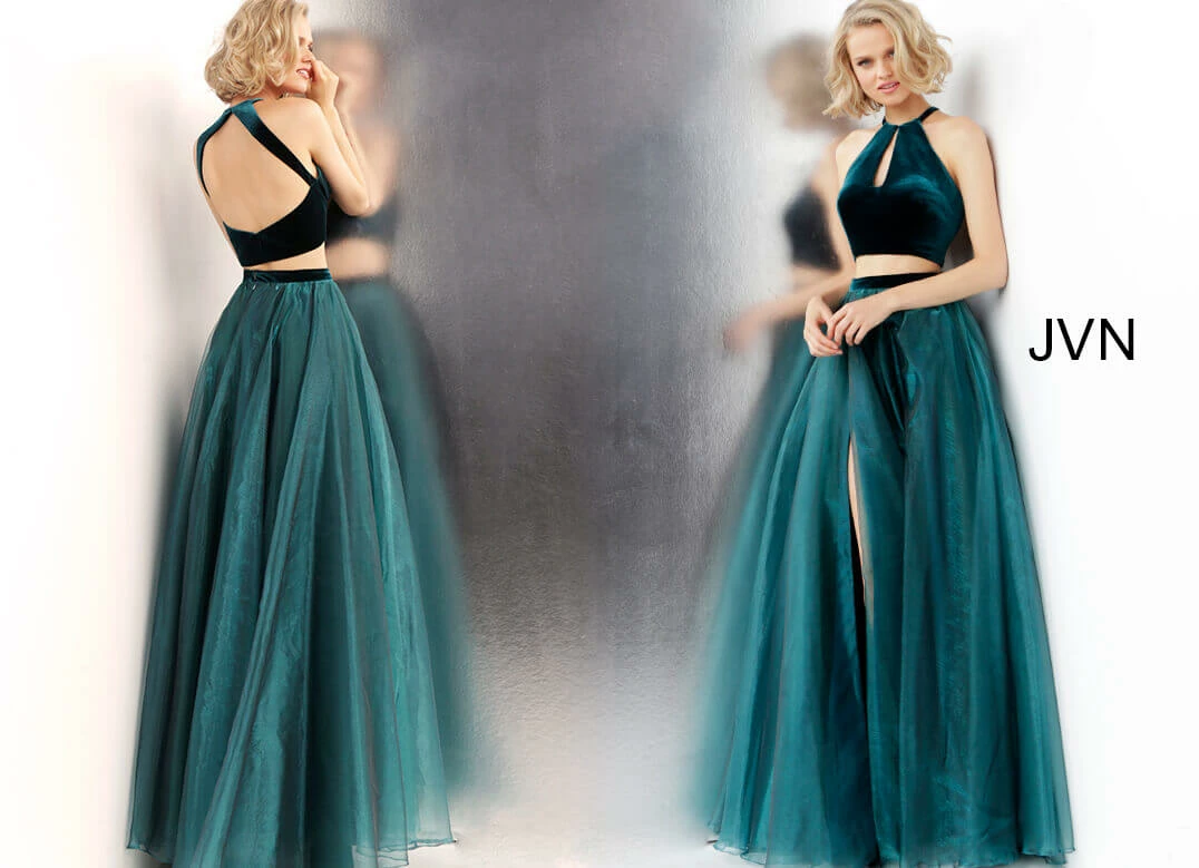 - Details: Green two piece velvet prom ballgown with sleeveless crop top, high neckline, key-hole cut-out and open back, floor length a-line pleated skirt featuring a velvet waistband and high leg slit.