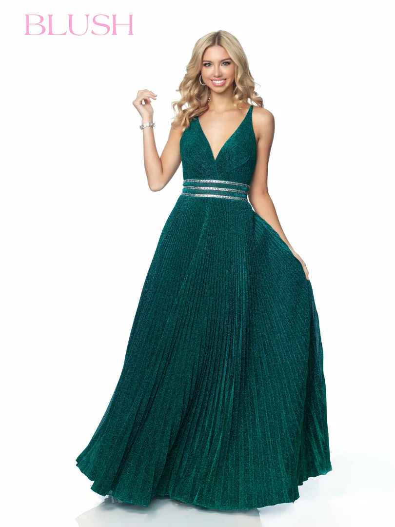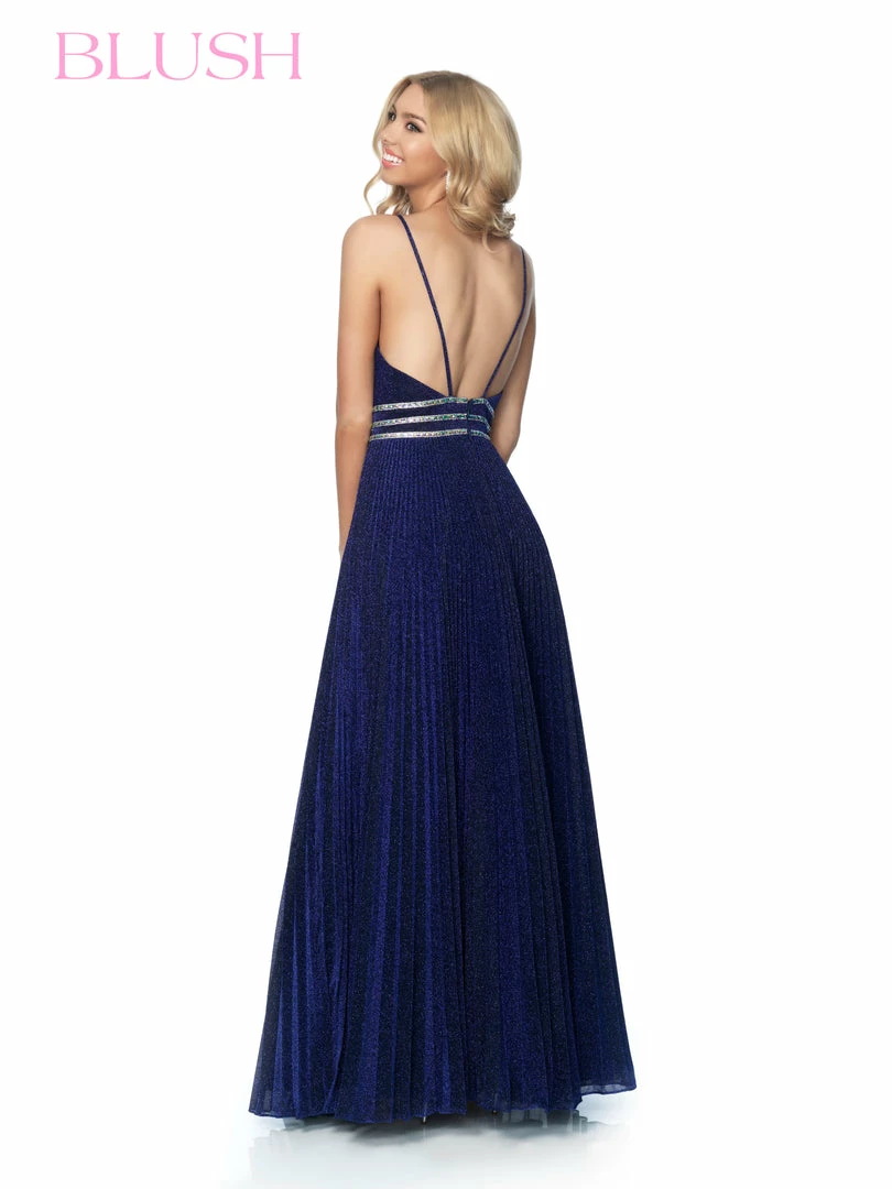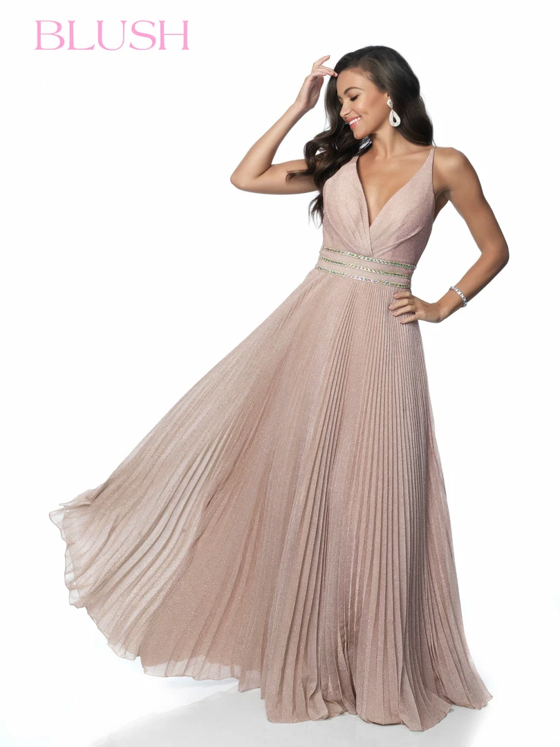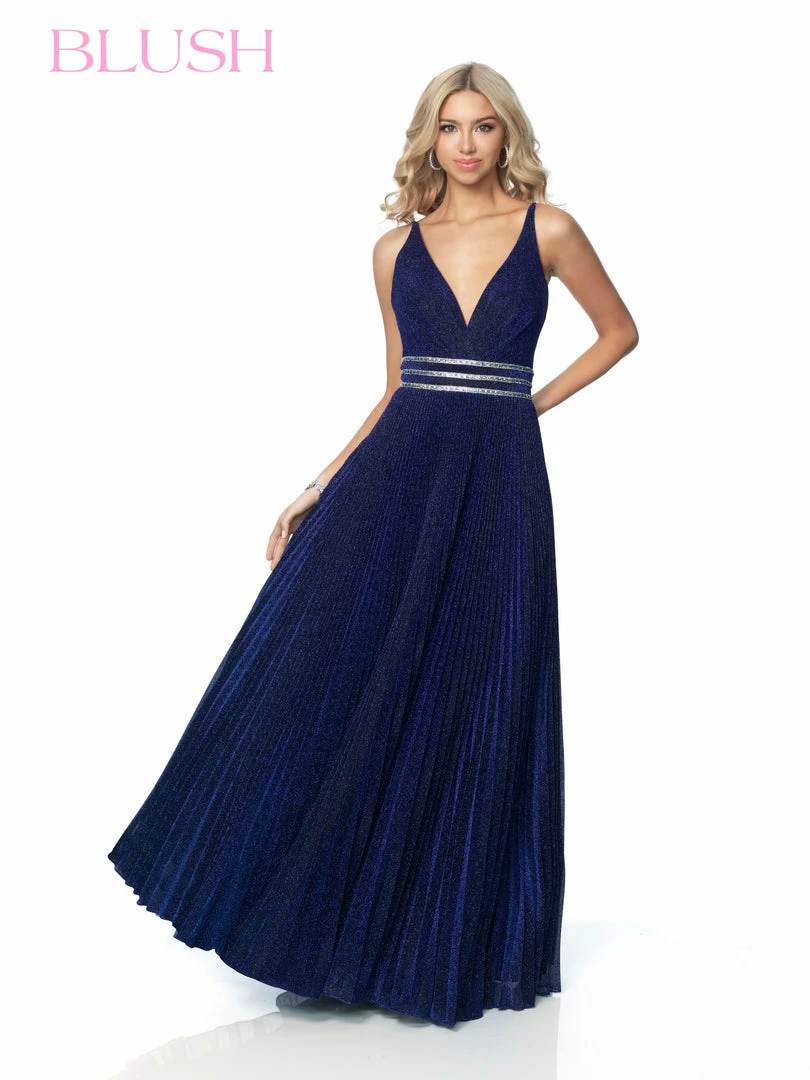 Blush Prom Dress 11899 Is fit for a Goddess! This Amazing Pleated Shimmer A Line Ball Gown Features an embellished waistband with rows of AB Crystals to set off the Vibrant Shimmer Fabric. Pleated skirt with a deep V Neckline and Low back.