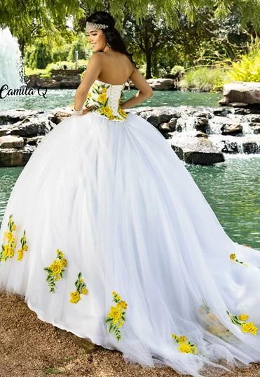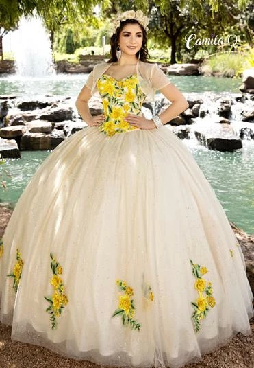 Camila Q Quinceanera Dress Q 1001 sweetheart neckline lace up corset back embroidered floral quince dress with bolero jacket.