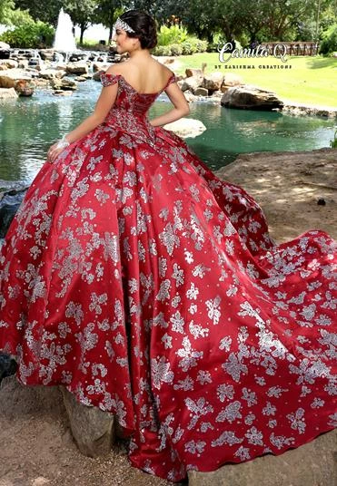 Camila Q Quinceanera Dress Q 1005 off the shoulder embellished applique full satin skirt.