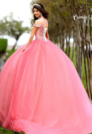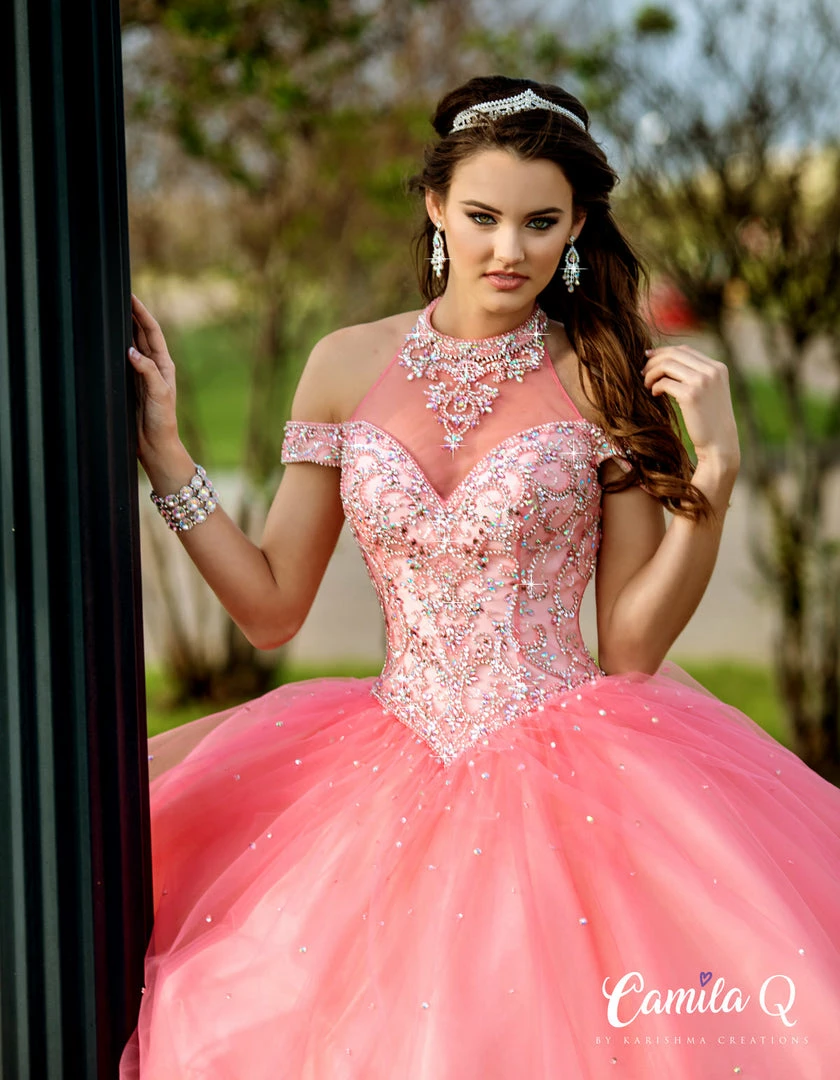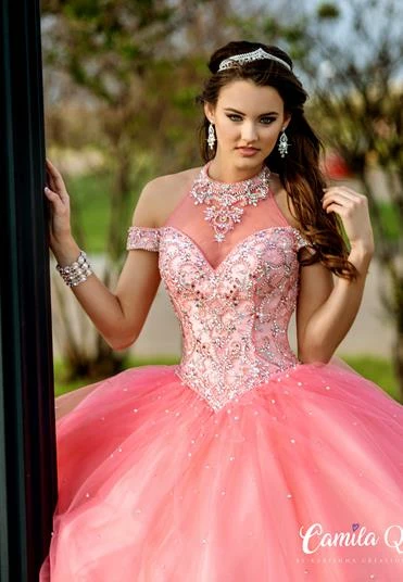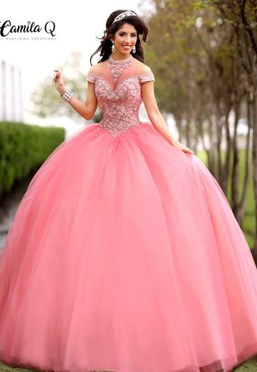 Camila Q Quinceanera Dress Q 17102 off the shoulder with sheer neckline that leads to an embellished collar with a lace up corset back and full tulle skirt.Β