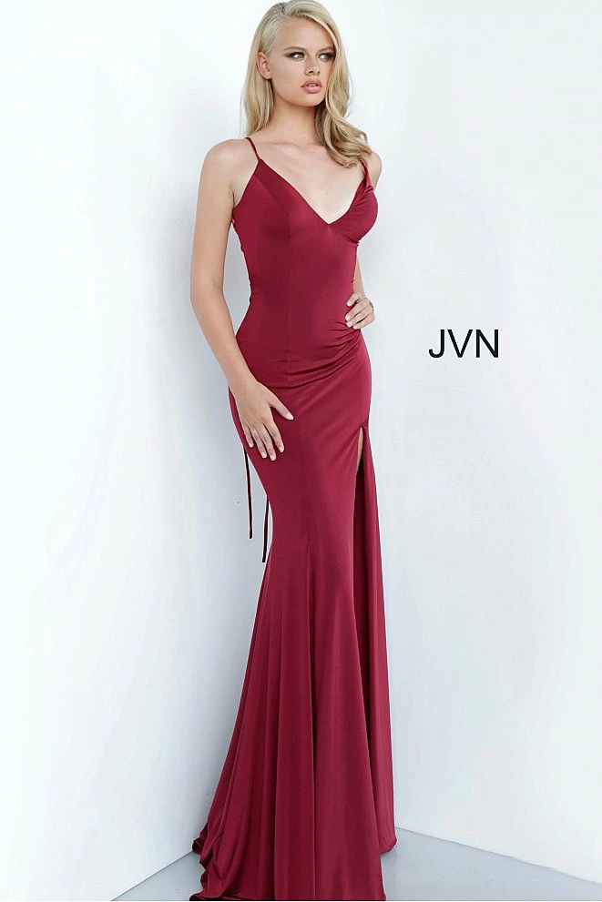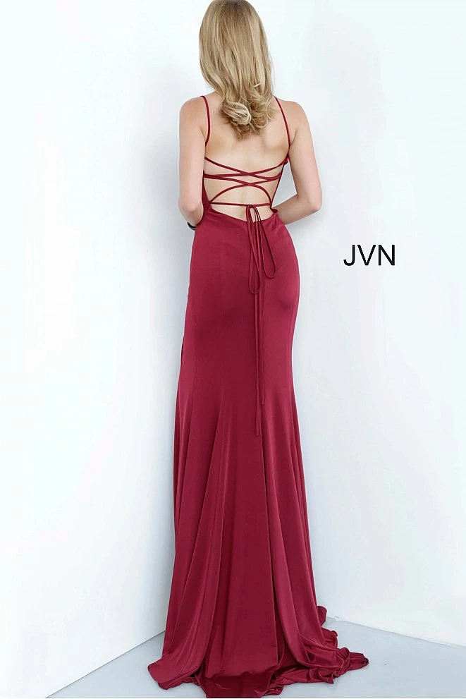 JVN02071 v neckline criss cross tie corset open back stretchy fitted prom dress evening gown bridesmaids dress with sweeping trainÂ
