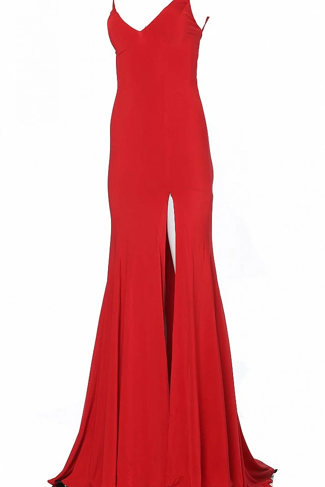 - Details: Simple satin back prom dress, form fitting silhouette, floor length skirt with high slit and sweeping train, spaghetti straps bodice with V neck and open lace up back.