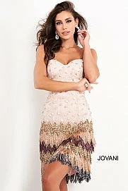 Jovani 2657 Short form fitting multi cocktail dress features fringe skirt and sleeveless paillette bodice with sweetheart neckline and straps over shoulders. Short Evening Cocktail Pageant Dress Party Dress