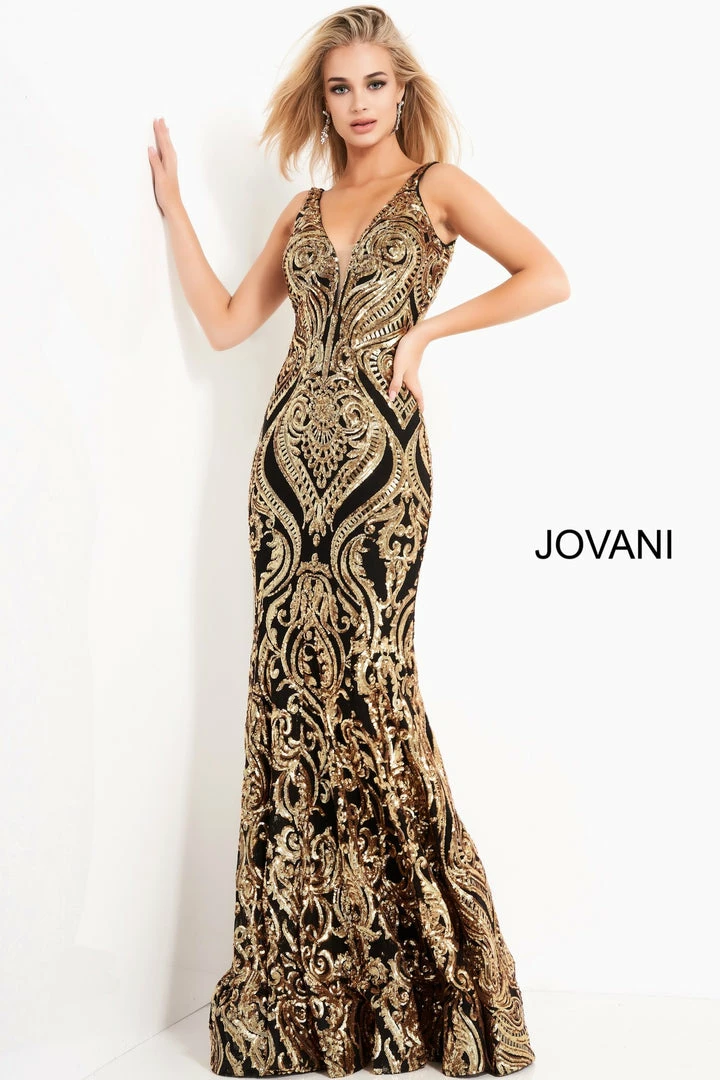 Jovani 2669 Is a Stunning Long Fitted Sequin Embellished Prom Dress. Features an Damask Print Embellishments With a Deep V Plunging Neckline, Open Back and Flare at bottom of skirt. Sequin embellished fabric, form fitting silhouette, floor length, sleeveless bodice, plunging sweetheart neckline with sheer mesh insert for support, V back, straps over shoulders. Long one-shoulder lace sleeveless designer prom dress with a trumpet skirt and sheer side insets. Long one-shoulder lace sleeveless designer prom dress with a trumpet skirt and sheer side insets.