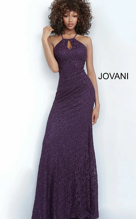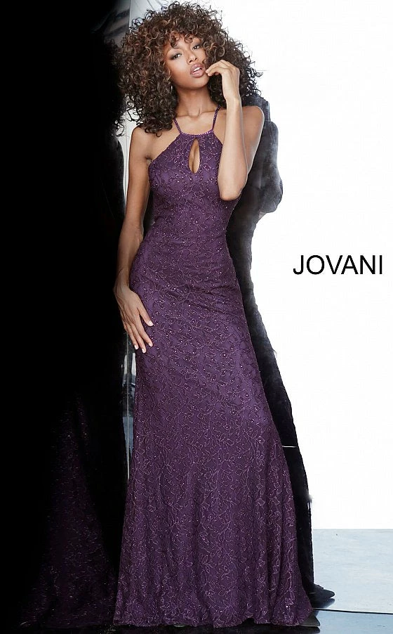 Jovani 4032 is a Long Fitted Dark Floral Embellished Lace Prom Dress. This High Keyhole Neckline Mermaid Evening Gown is Backless!  Embellished lace prom dress, form fitting silhouette, floor length, sleeveless bodice, scoop neckline with key hole opening, open back with embellished straps.