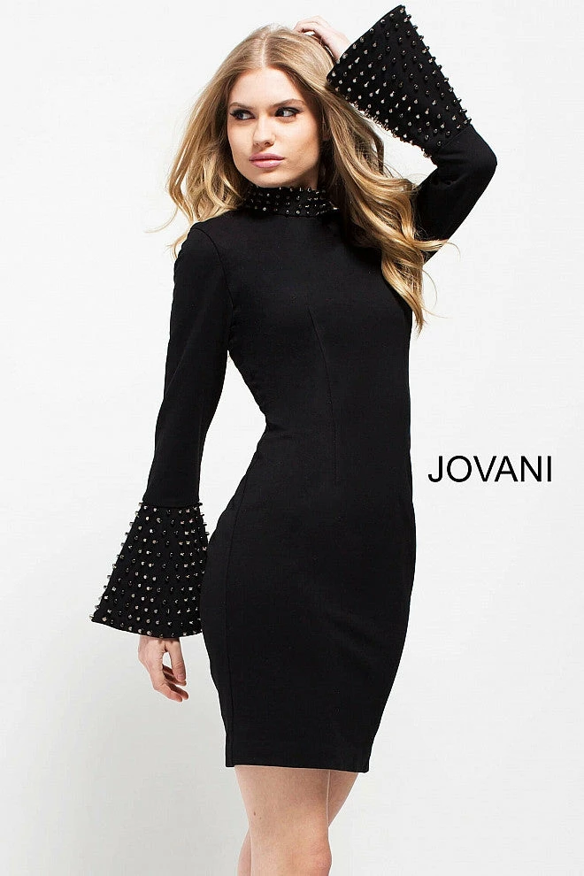 Jovani 51675 short fitted dress with embellished high collar neckline and embellished bell sleeves in Black Long Embellished Bell Sleeve High Neck Collar Full Coverage