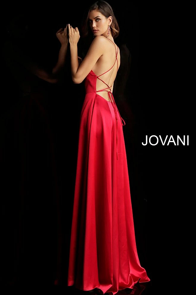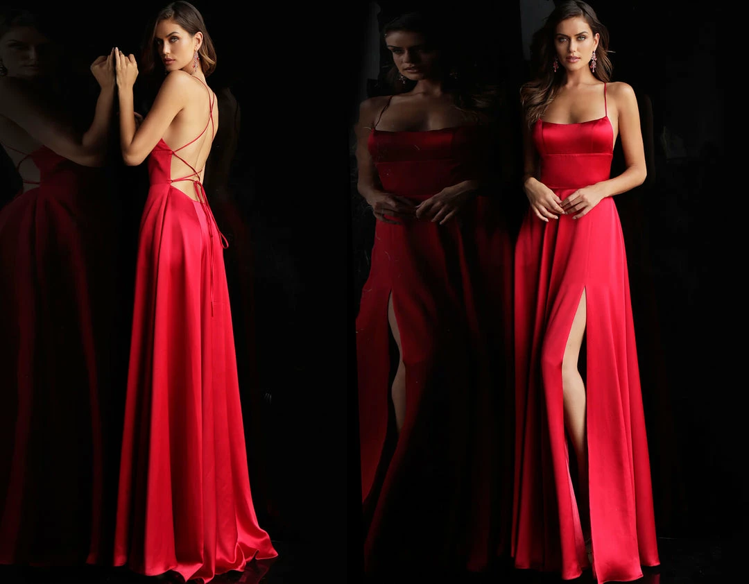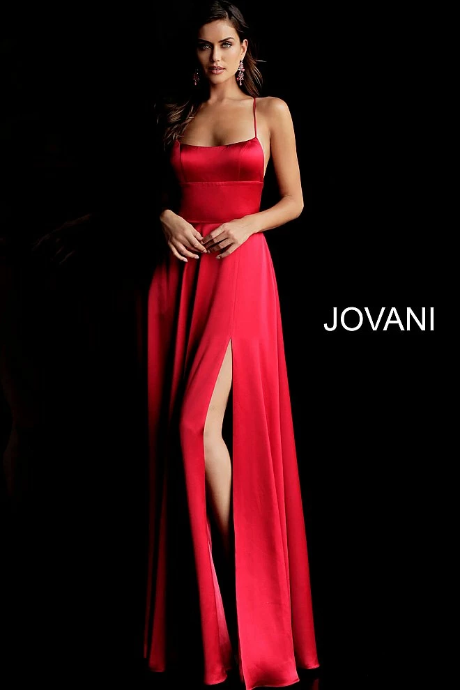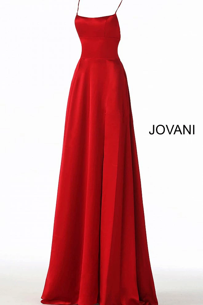 Details: Red satin simple long prom dress with sleeveless fitted bodice, straight neckline and spaghetti straps, lace-up strap open back and floor length flowy pleated skirt with high side slit.