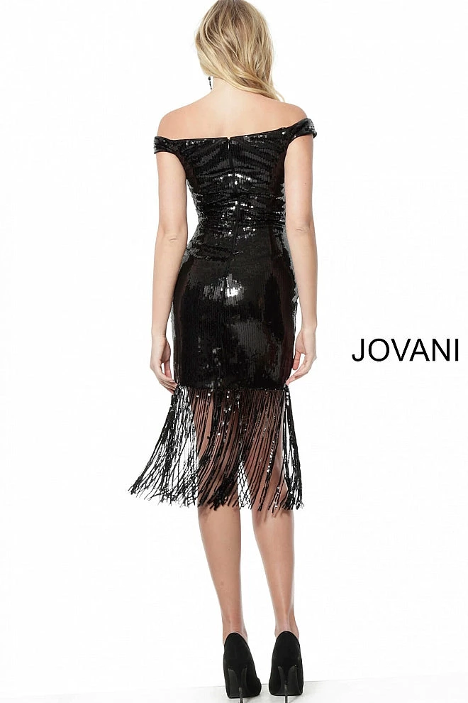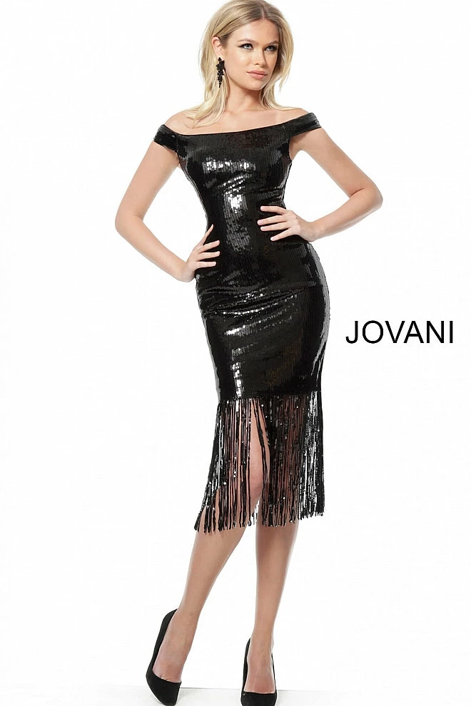 Black Off the Shoulder Fitted Sequin Cocktail Dress with fringe skirt 63636
