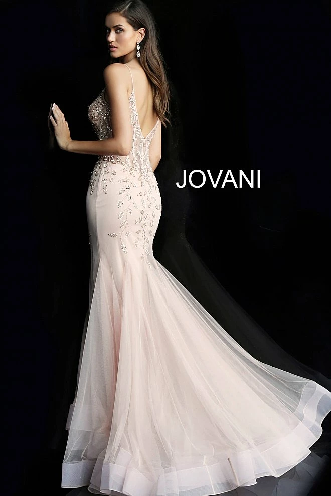 Details: Blush embellished mermaid prom gown with spaghetti straps, sleeveless sheer corset bodice, low v-neck, and v-back, floor length fitted skirt with a sheer flared end and horsehair trim. Long sleeveless v-neck mermaid-style Jovani designer prom dress with beaded details and a sheer bodice.