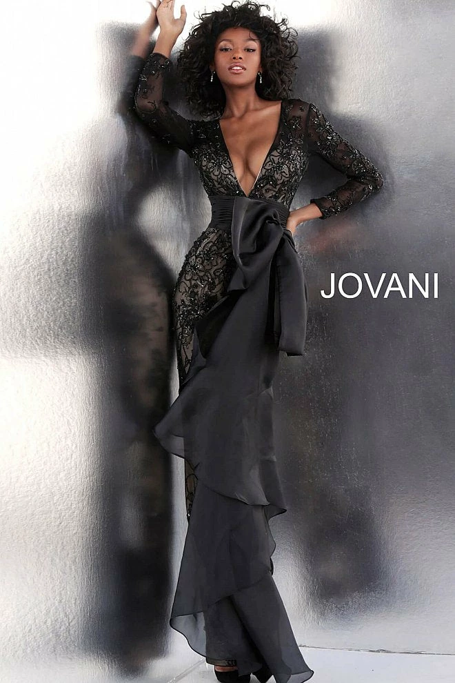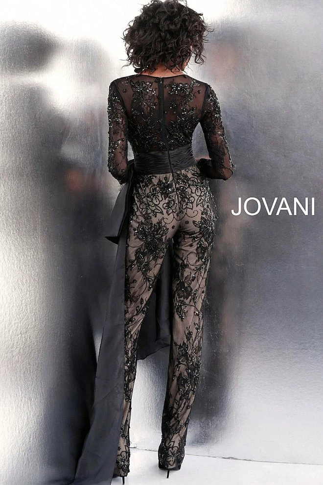 Details: Black sheer embellished jumpsuit featuring nude underlay with long sleeve fitted bodice, low v-neckline and closed sheer back, oversized waist bow and full length straight leg pant.