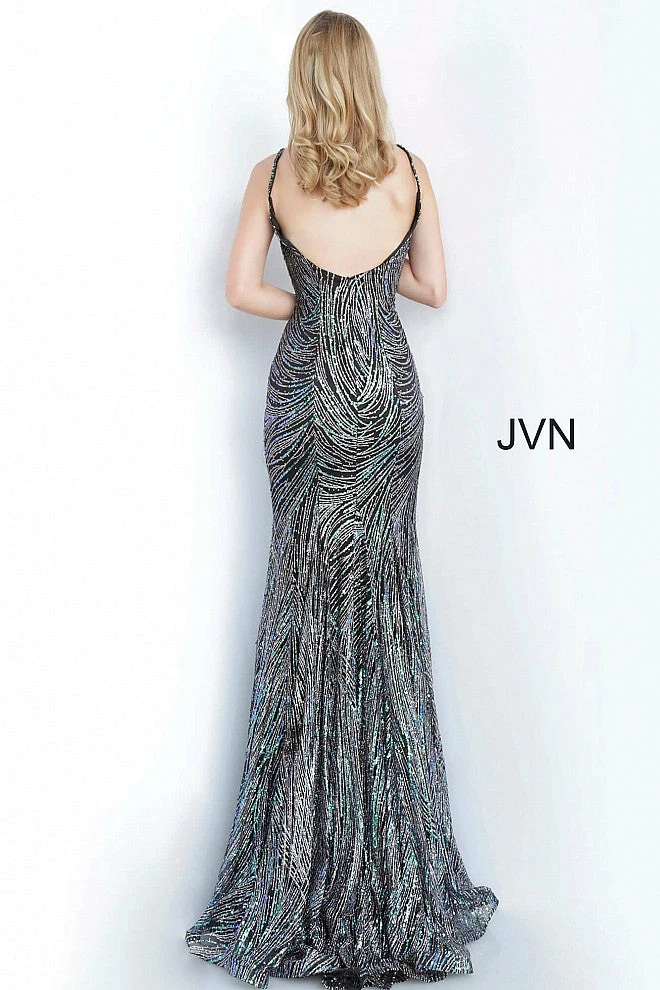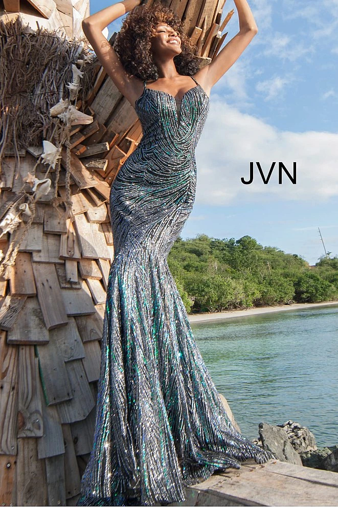 Jovani JVN 02432 is a Long Fitted Prom Dress. Featuring Sequin & Glitter Embellished Fabric for a Dimensional Color Shine! Plunging Deep V Neckline with a sheer mesh panel. spaghetti straps. Slight Mermaid SilhouetteΒ