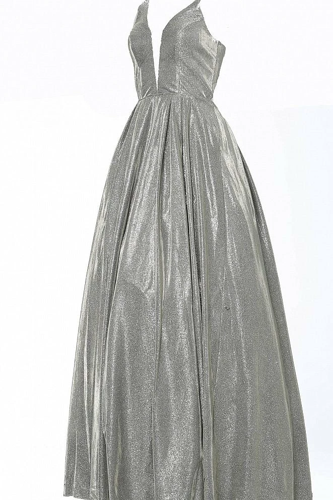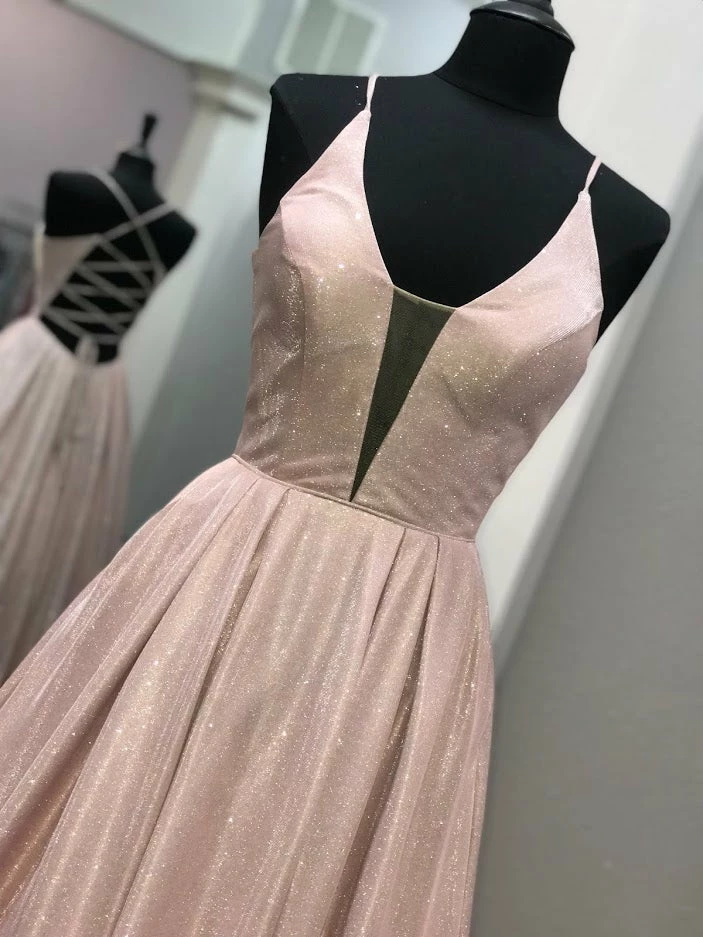 - Details: Glitter prom ballgown, floor length full skirt with pockets, sleeveless bodice, deep V neck with sheer mesh for support, straps over shoulders, tie back.
