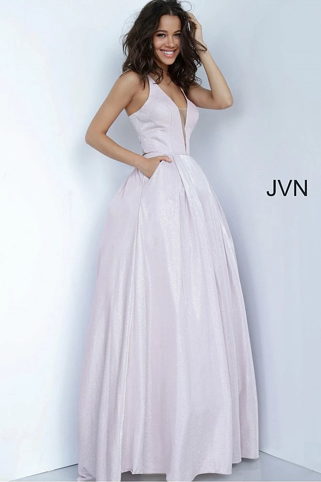JVN2172 Plunging neckline open back criss cross tie shimmer A line prom dress ball gown evening gownÂ