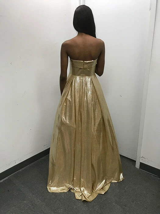 JVN2392 by Jovani is a Prom Dress made with a stunning Metallic Shimmer Fabric. This strapless Ballgown Features a strapless straightΒ neckline with a Lush Pleated Skirt with a sweeping train in the back. Simple & Elegant with a touch of Glam! JVN 2392